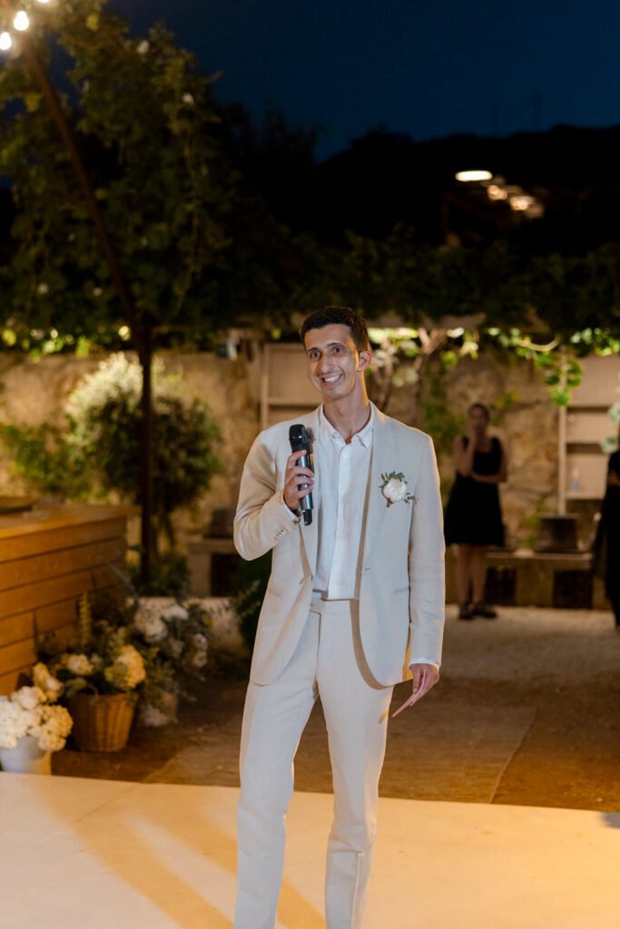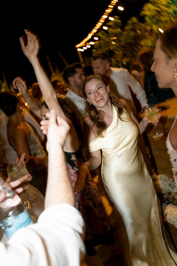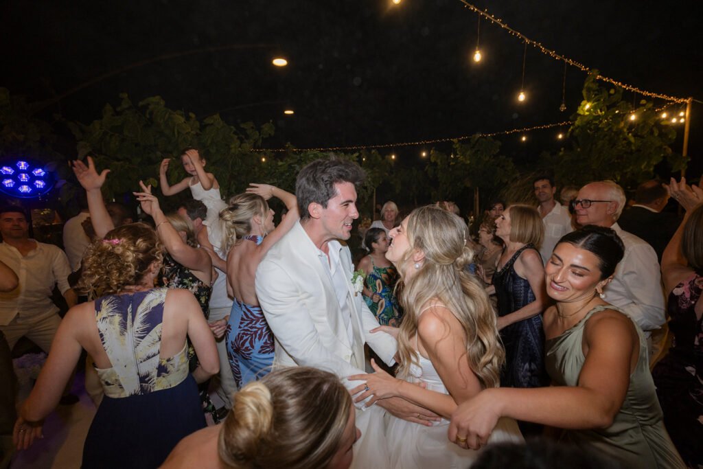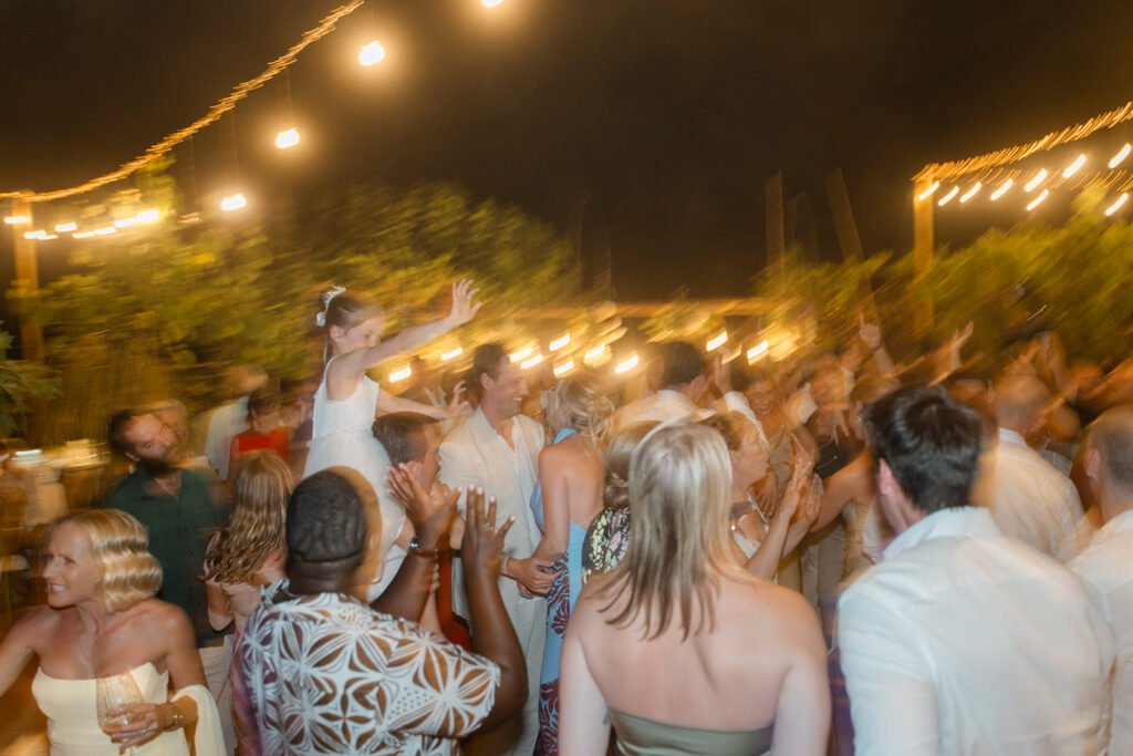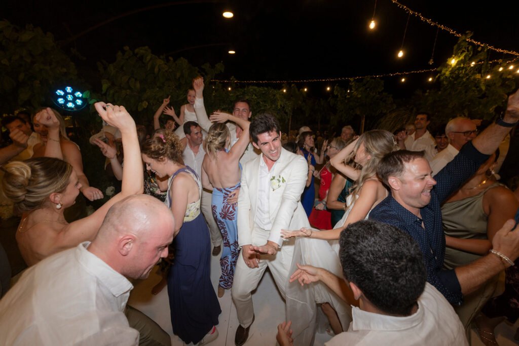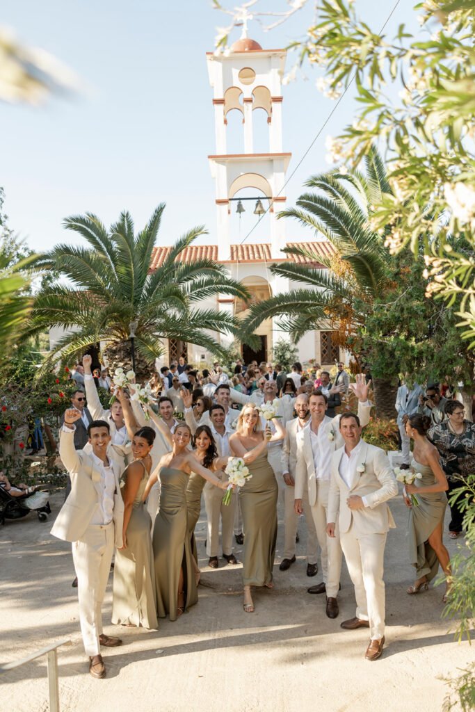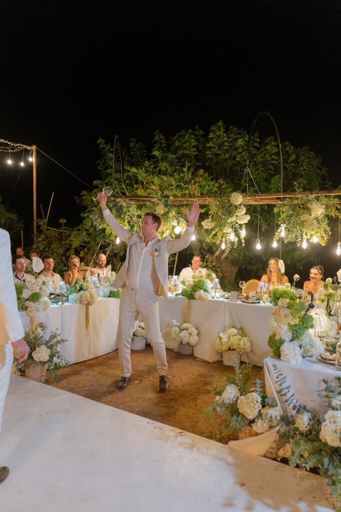 The energy of the celebration continued as the couple made their grand entrance alongside their friends, performing the Cretan “sousta,” an iconic dance known as the island’s traditional love dance. This moment was filled with joy, laughter, and movement, immediately setting the tone for the rest of the evening.