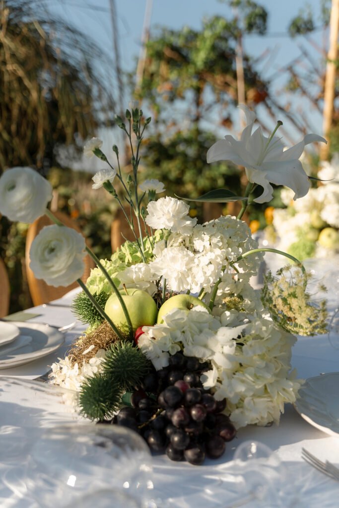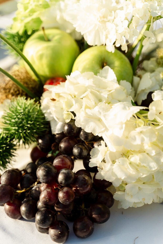 The reception decor was a reflection of both the couple’s personal style and the natural charm of the farm. Tables were adorned with a unique combination of flowers and fresh fruits, creating a visually striking yet organic look. Every detail was carefully chosen to complement the rustic farm setting while keeping a modern, sophisticated vibe.