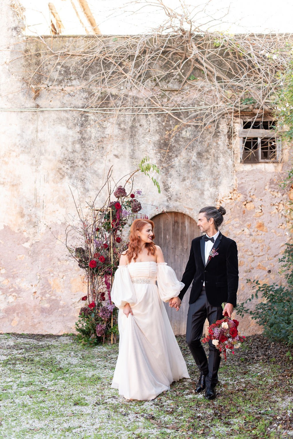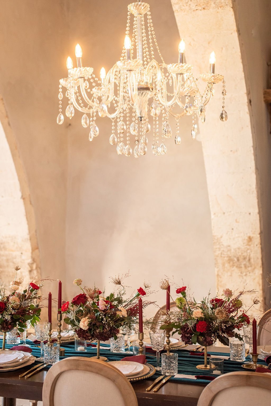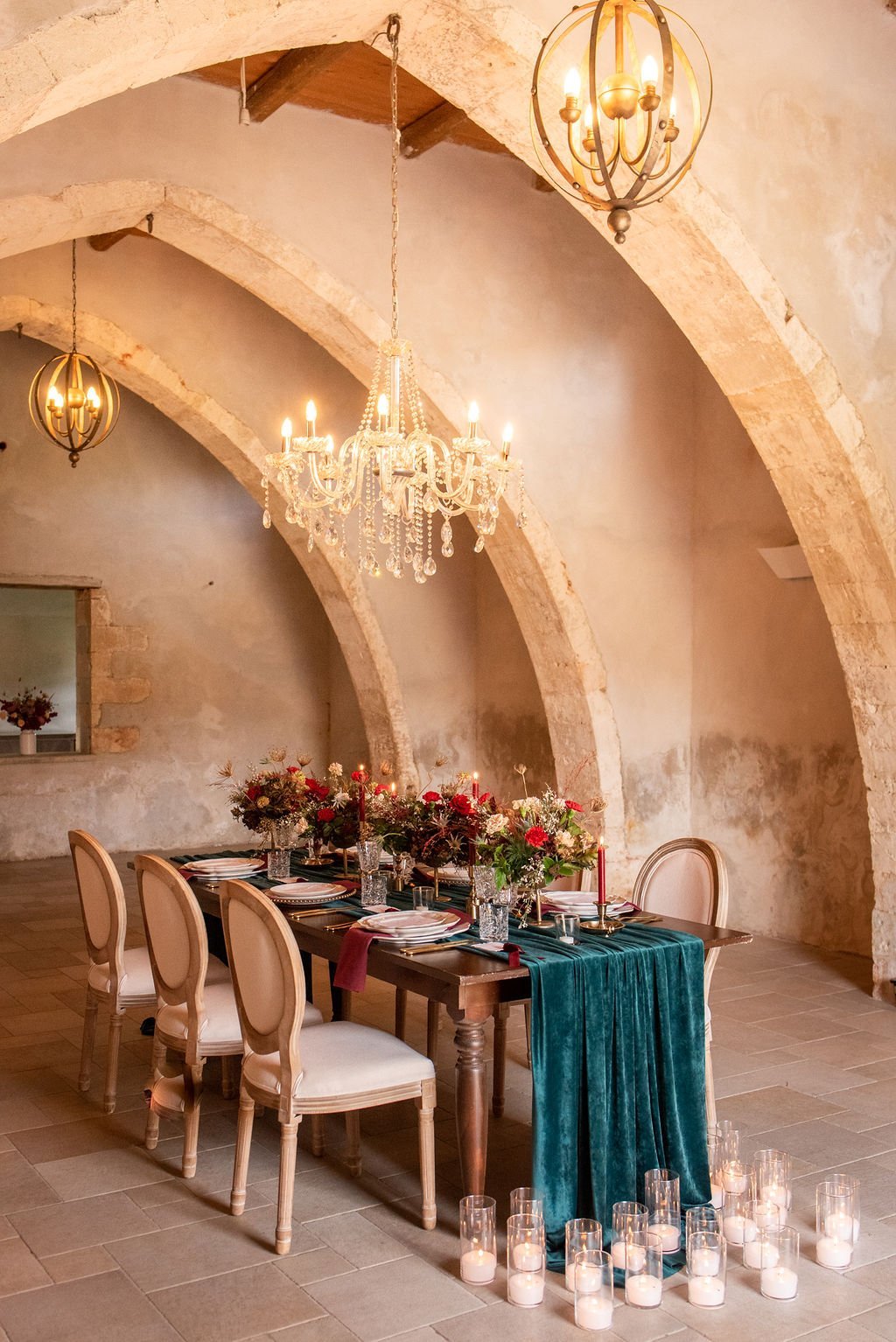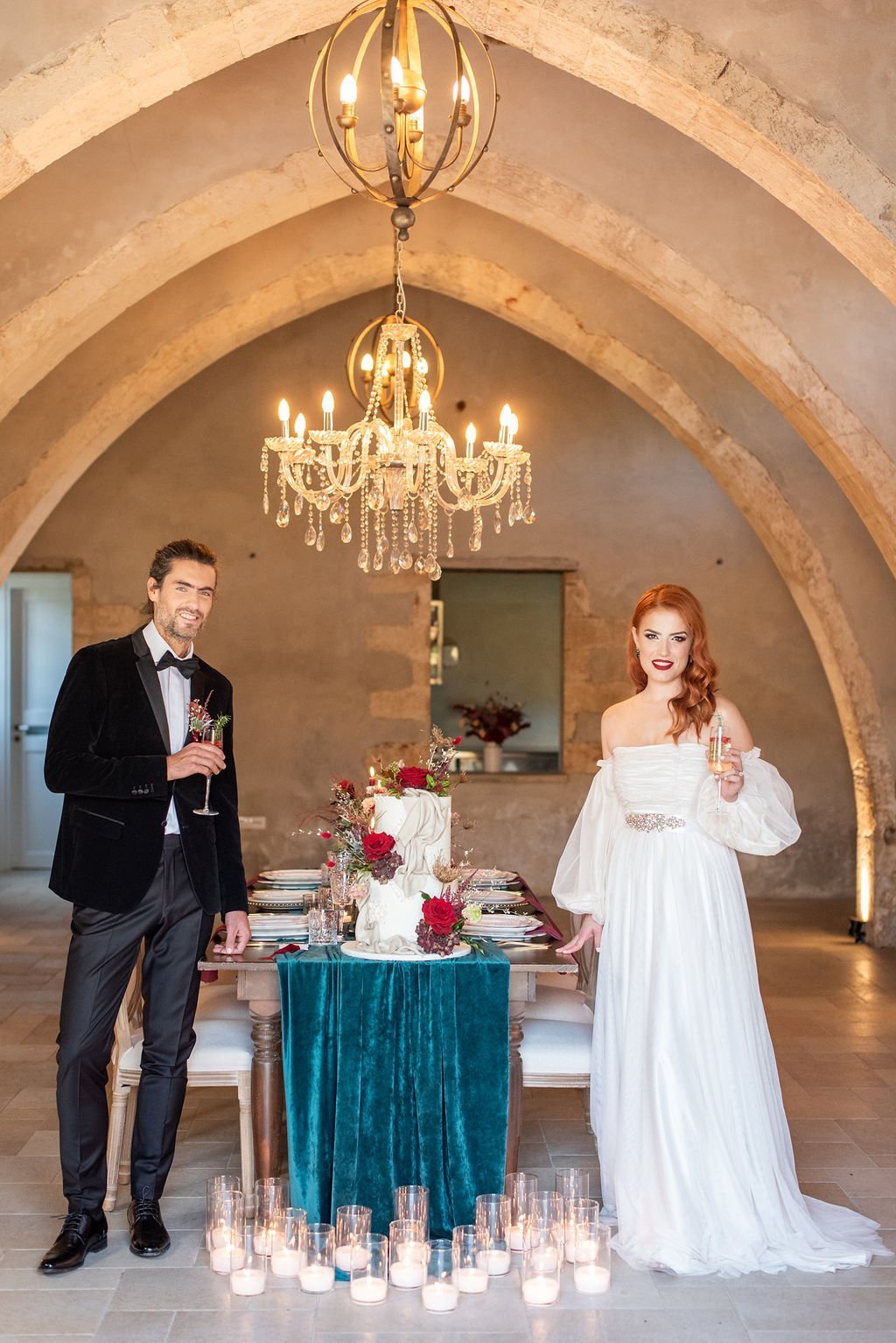 This winter wedding styled shoot took place last December on the island of Crete and was designed to showcase the quiet magic and romance of the off-season. Set within a breathtaking 15th-century venue, the concept embraced history, warmth, and atmosphere, transforming ancient stone walls and grand halls into an intimate winter haven. Flickering candles filled the space with soft light, while a dramatic statement chandelier suspended above the dining table became the heart of the design—its glow reflecting beautifully against the historic architecture and creating a scene that felt both timeless and cinematic. The venue itself, Metohi Istoria, offered the perfect canvas where past and present merged seamlessly into a deeply romantic setting.