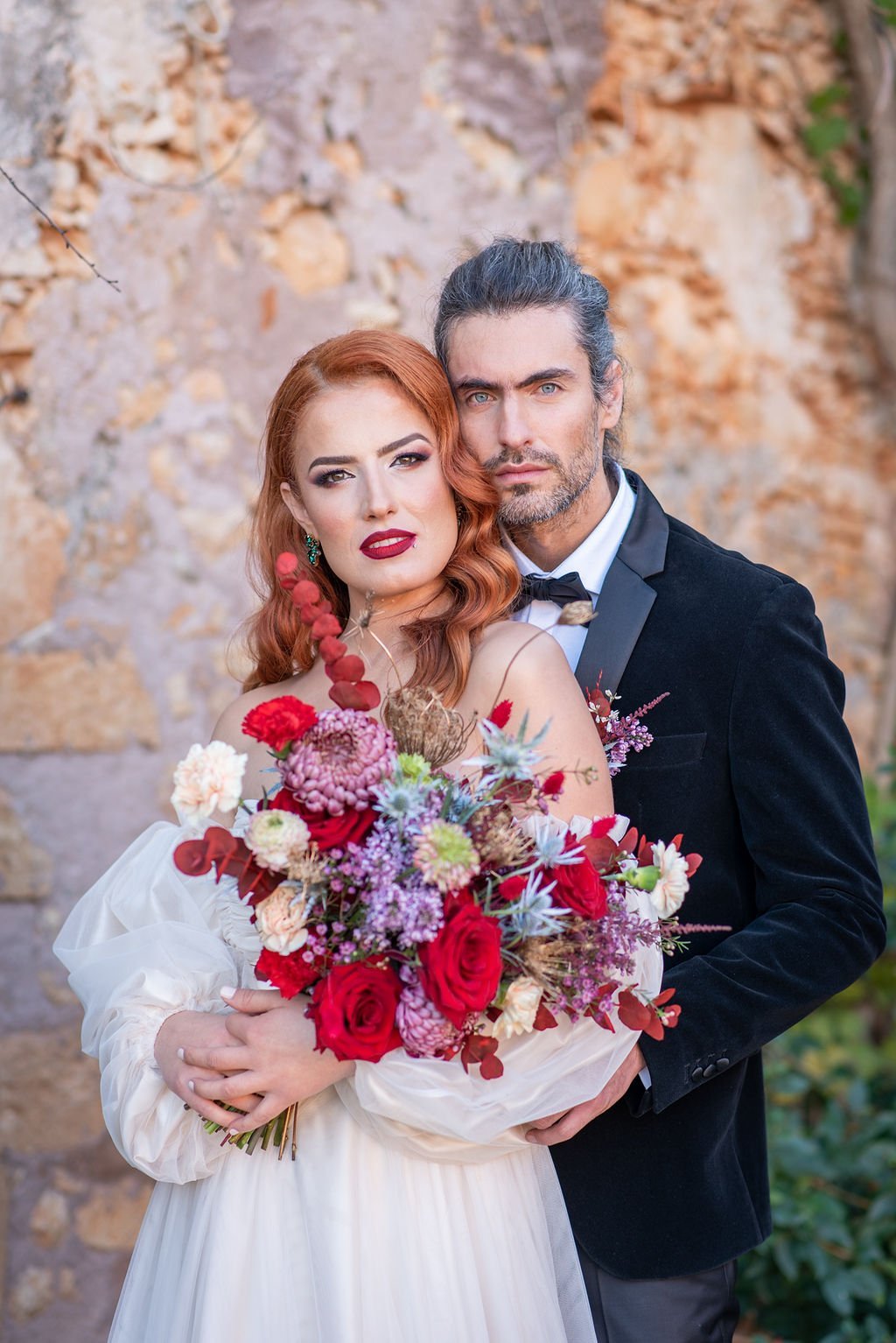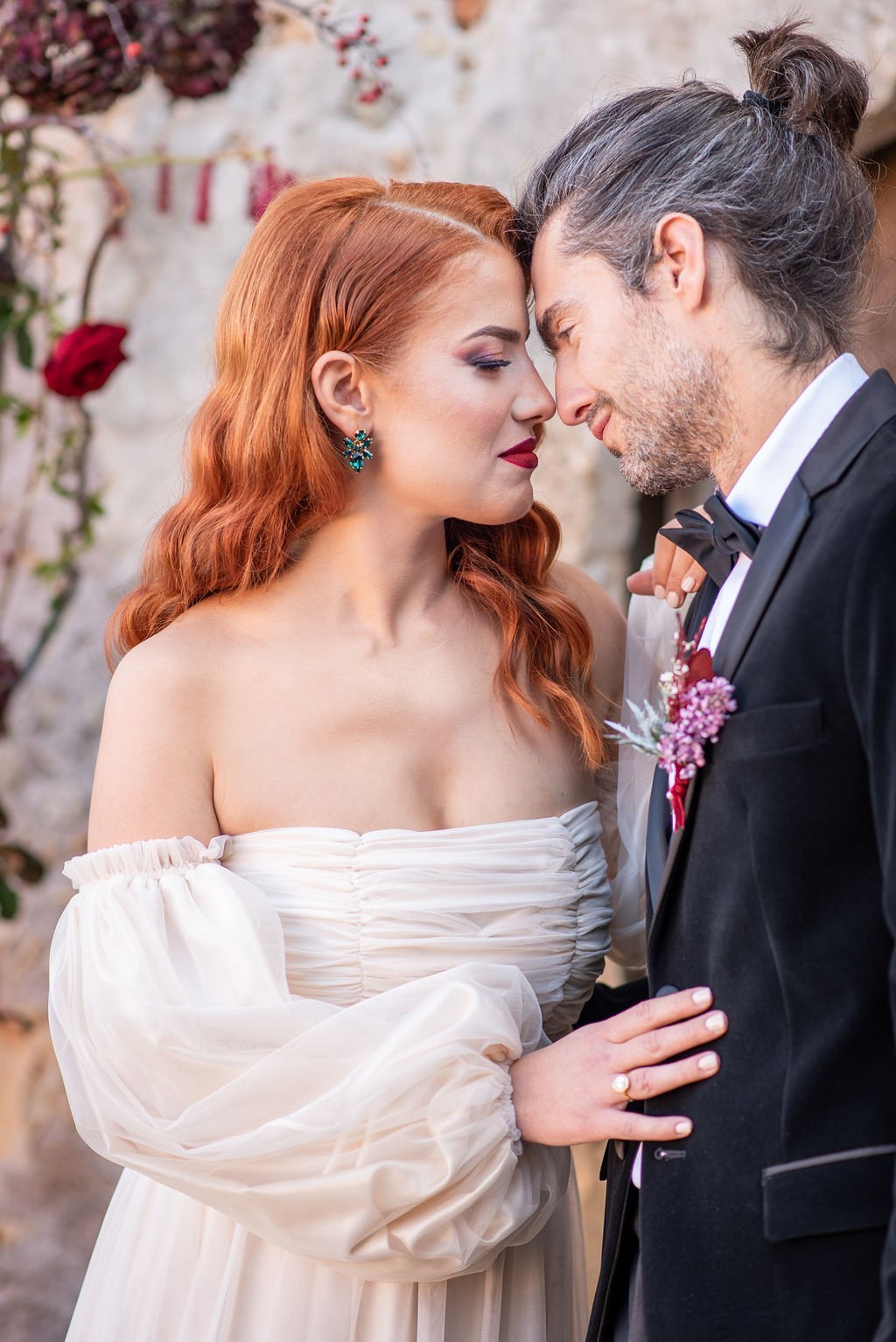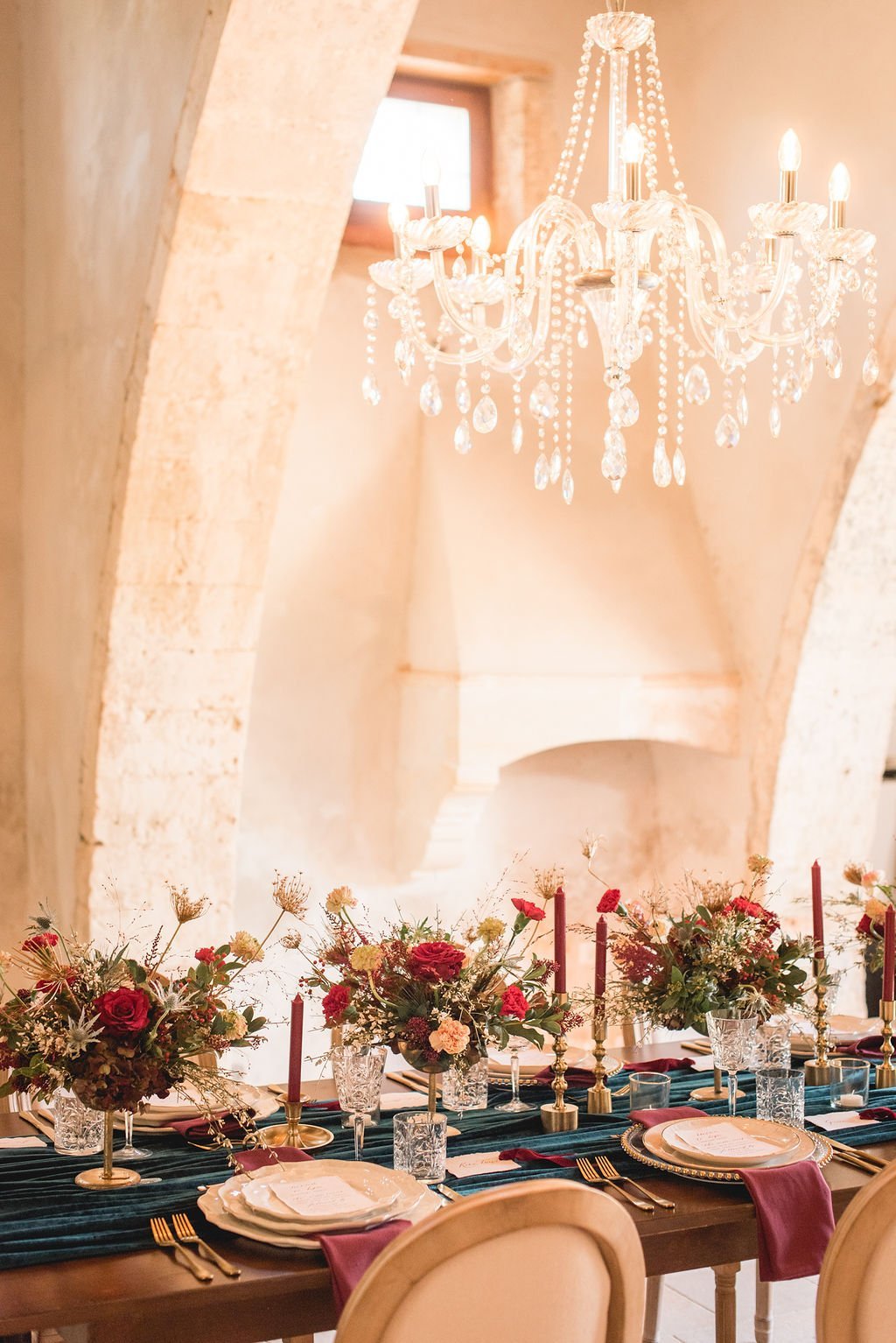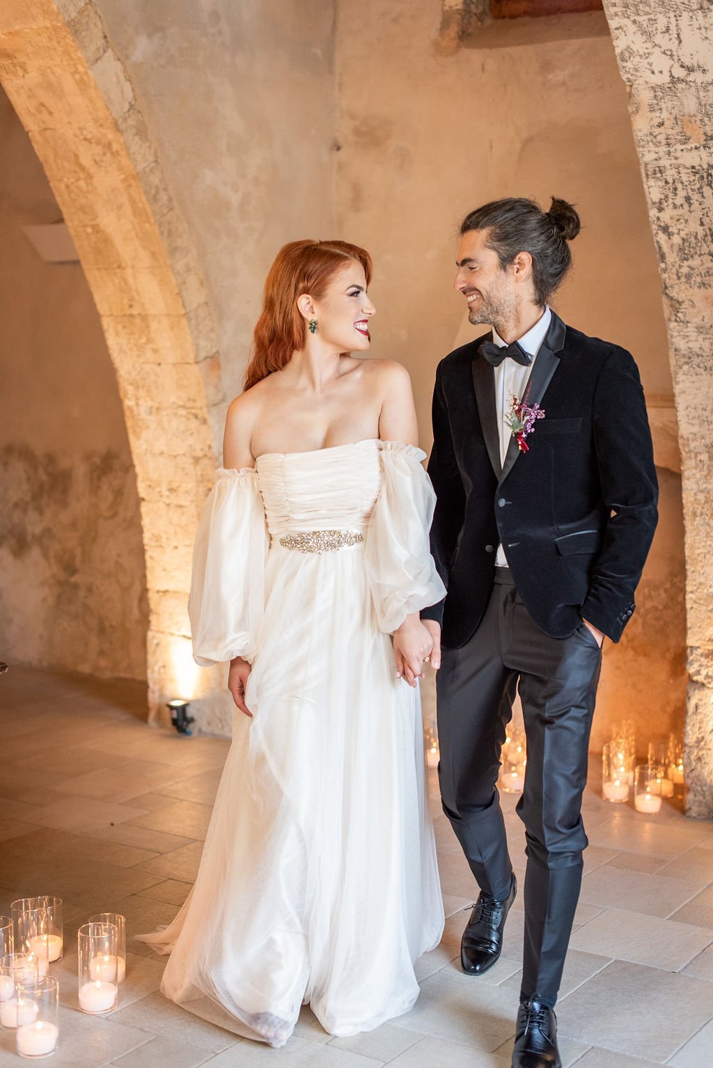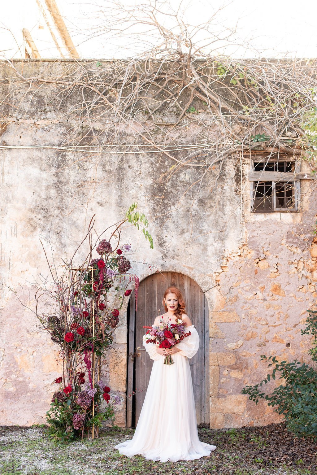 This winter wedding styled shoot took place last December on the island of Crete and was designed to showcase the quiet magic and romance of the off-season. Set within a breathtaking 15th-century venue, the concept embraced history, warmth, and atmosphere, transforming ancient stone walls and grand halls into an intimate winter haven. Flickering candles filled the space with soft light, while a dramatic statement chandelier suspended above the dining table became the heart of the design—its glow reflecting beautifully against the historic architecture and creating a scene that felt both timeless and cinematic. The venue itself, Metohi Istoria, offered the perfect canvas where past and present merged seamlessly into a deeply romantic setting.