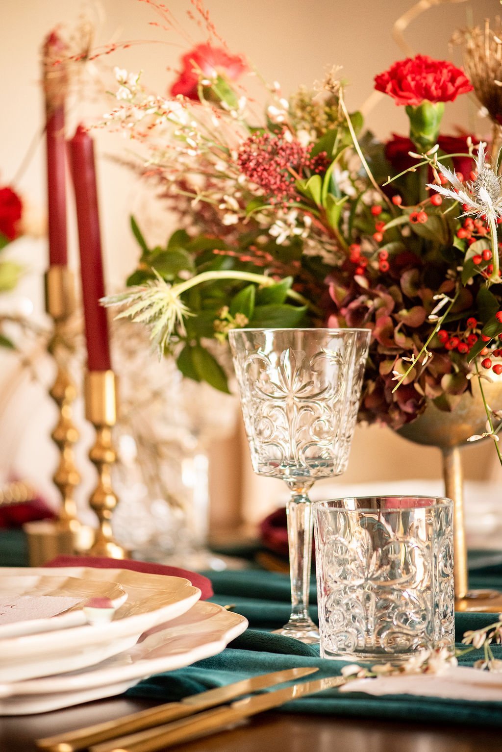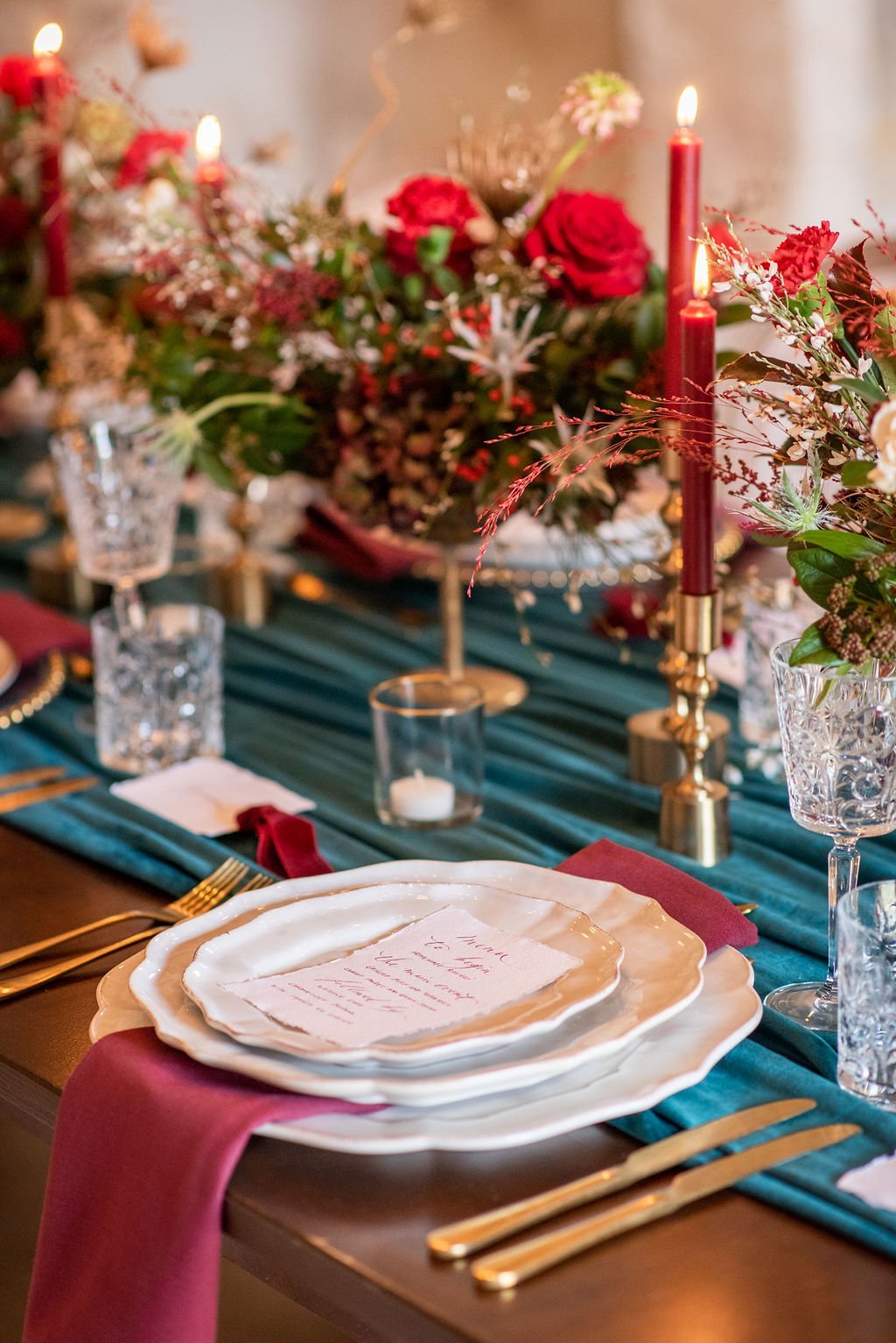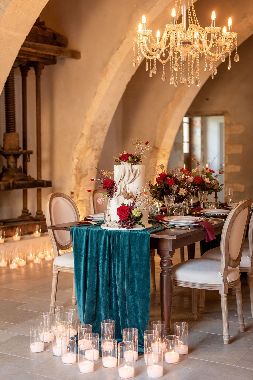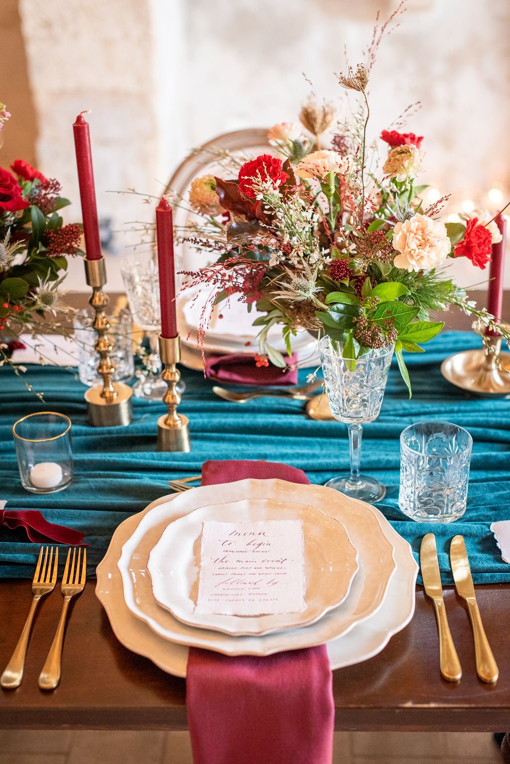 The design was completed with a rich, elegant palette of burgundy and deep green, chosen to evoke warmth and seasonal luxury. Velvet table runners and ribbons added texture and depth, while lush florals softened the grandeur of the space and balanced its architectural strength. Every element—from the layered candlelight to the tactile fabrics—was intentionally curated to create an immersive winter atmosphere that felt cozy yet refined. Thoughtfully planned and styled by The 25 Project, the shoot stands as inspiration for couples dreaming of a winter wedding that feels atmospheric, sophisticated, and unforgettable, proving that colder months can be just as magical as summer celebrations.