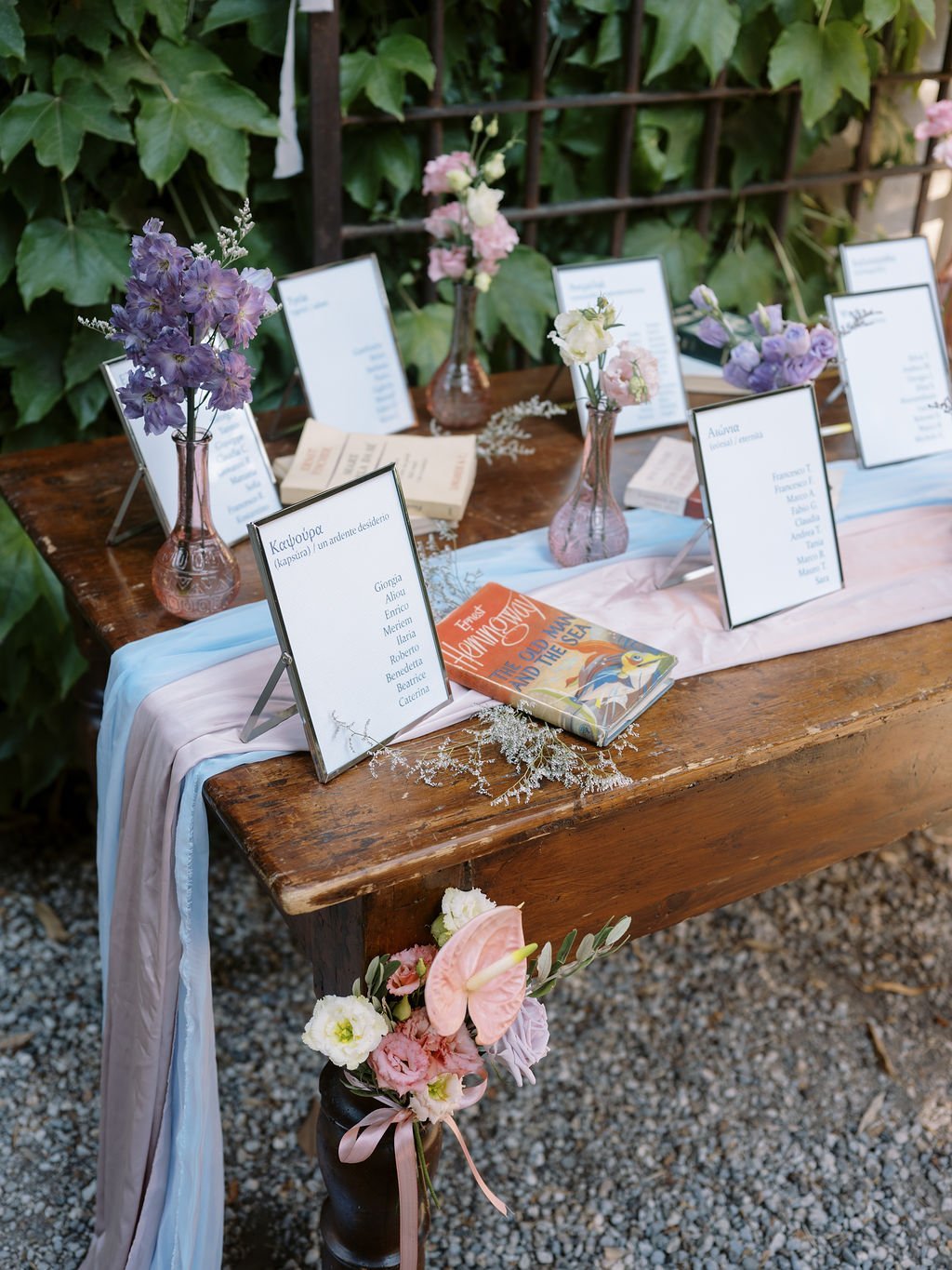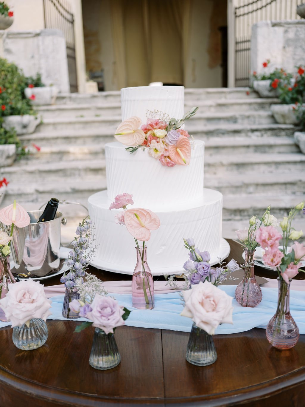 The celebration continued at a stunning villa, where guests gathered in a picturesque courtyard surrounded by lush greenery. A warm and inviting atmosphere set the tone, with live music, delicious finger foods, and refreshing drinks welcoming everyone. Dinner followed inside the villa, where pastel décor, lush floral centerpieces, and soft lighting created a romantic ambiance. As the night unfolded, the cake cutting took place outdoors before the party came alive with music, dancing, and joyful moments under twinkling lights. Eleni and Davide’s wedding was a seamless blend of romance, tradition, and celebration—an unforgettable day that beautifully honored love without borders.
