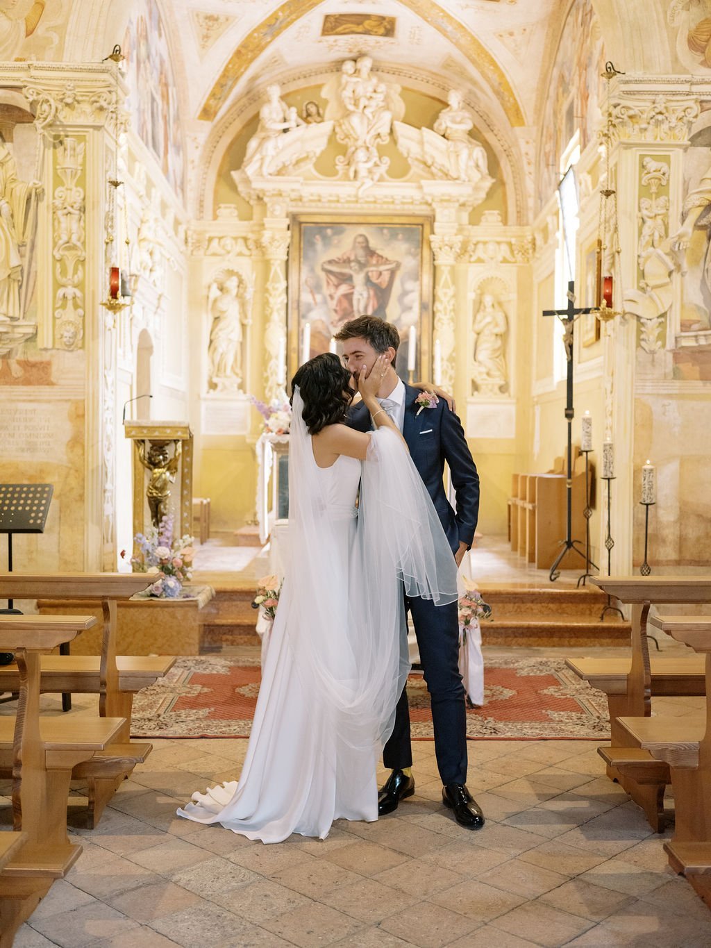 Love knows no borders, and Eleni and Davide’s wedding was a beautiful celebration of two cultures coming together. Eleni, originally from Greece, and Davide, from Italy, chose to say “I do” in a breathtaking Italian setting, surrounded by family, friends, and their two children. Their day began with a heartfelt Catholic ceremony held in an elegant church adorned with floral arrangements, where emotion filled the space as Eleni walked down the aisle and Davide watched with tears in his eyes. With their loved ones witnessing their vows, the ceremony felt deeply intimate and meaningful, perfectly reflecting the union of their lives and heritage.