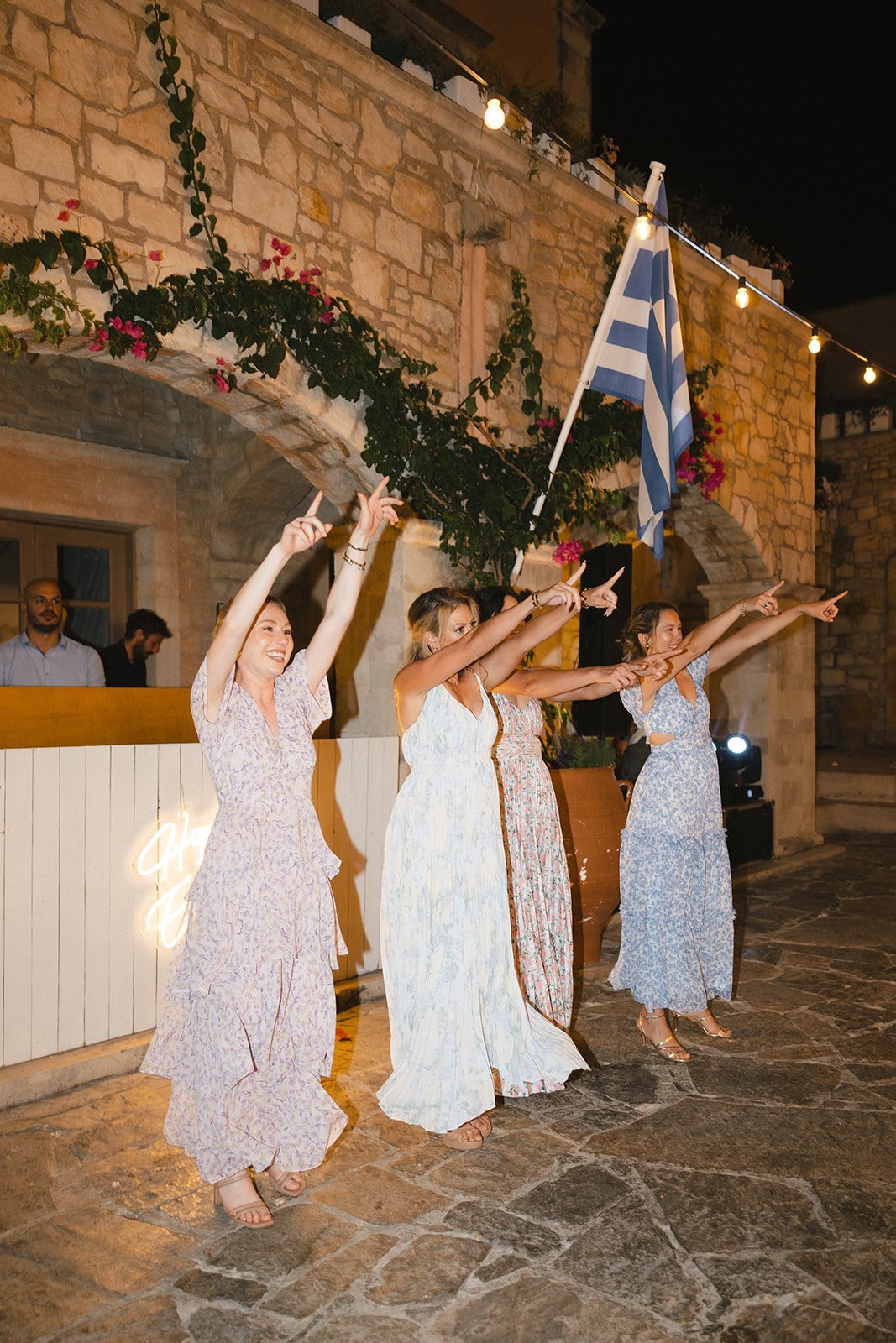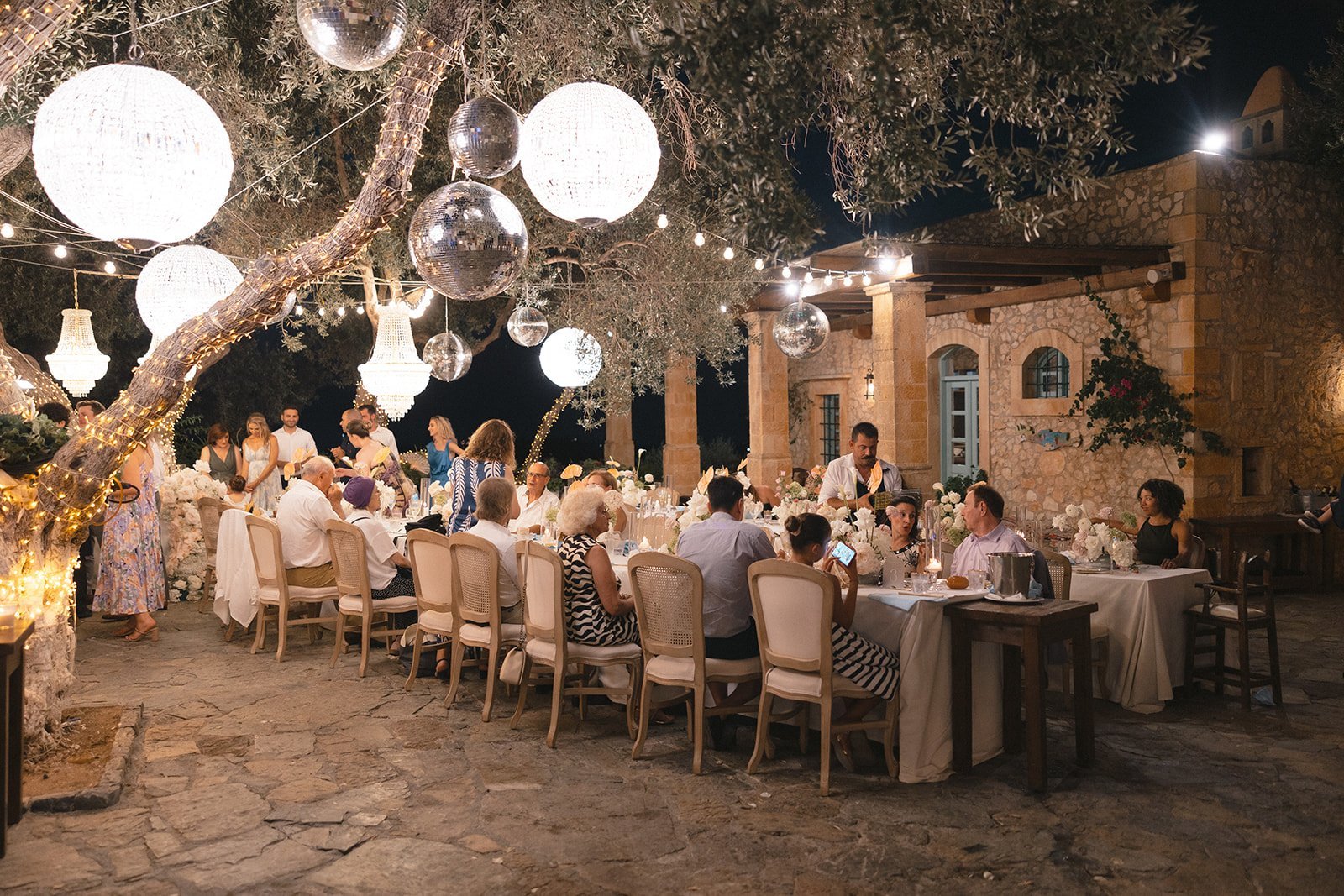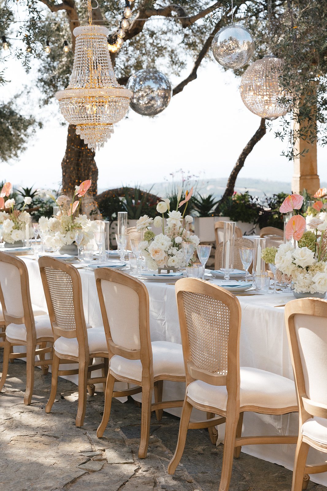 Following the ceremony, guests enjoyed a cocktail hour showcasing authentic Cretan flavors paired with the gentle melodies of a violin and cello duo, setting a relaxed and sophisticated tone. The reception transformed the farm into a magical space, featuring a striking mix of chandeliers and disco balls that added glamour and movement to the rustic setting. Pastel florals, candlelit tables, and Greek-inspired cuisine completed the experience before the celebration moved into full party mode. Paige and Spiro’s first dance, a surprise bridesmaids’ flashmob, and nonstop dancing created an electric atmosphere that carried late into the night. Their wedding at Agreco Farm was a joyful, heartfelt celebration—beautifully curated, deeply personal, and truly unforgettable for everyone who shared in their day.