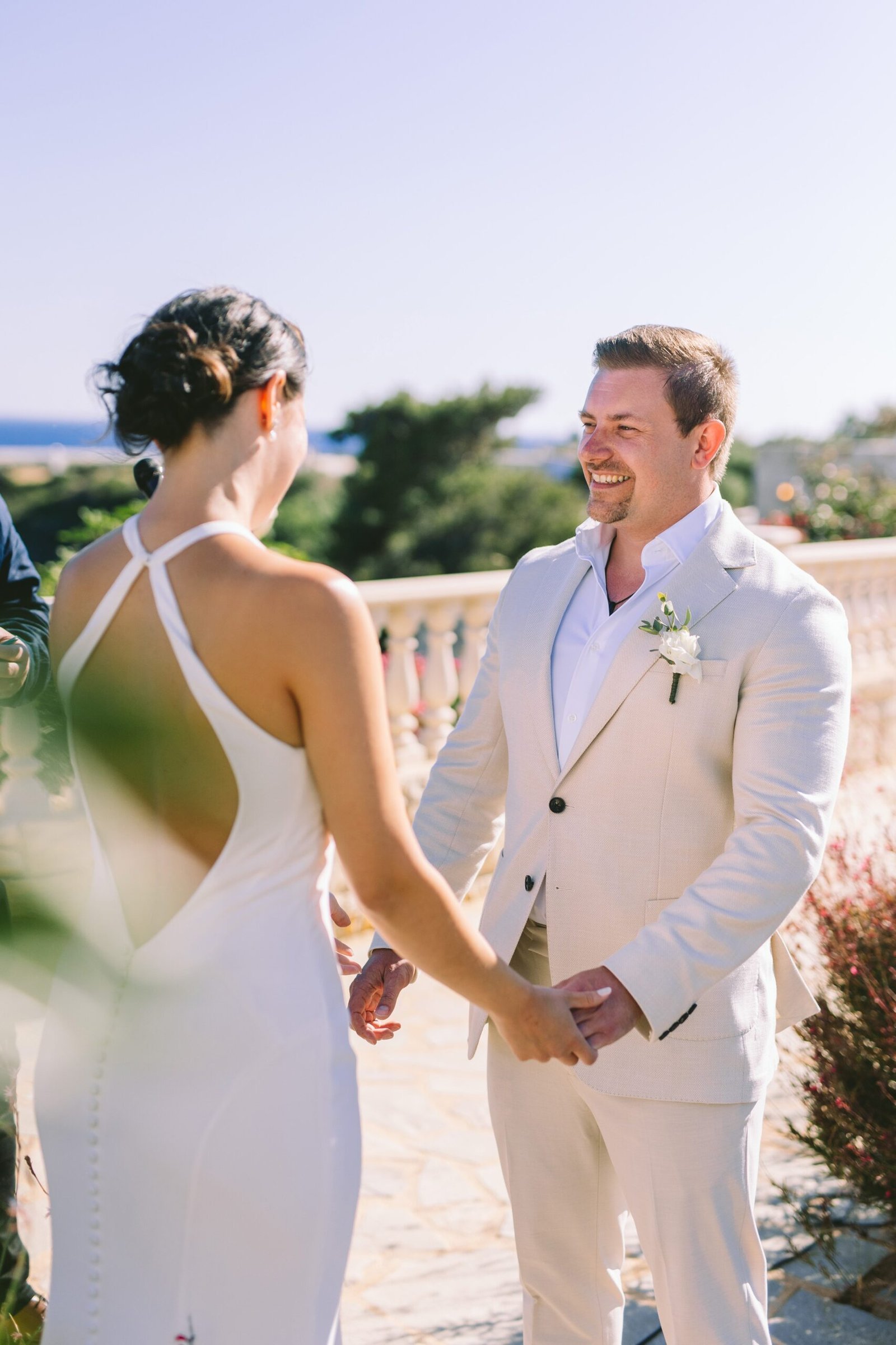 The couple wanted everything to feel simple, relaxed, and natural. The villa itself needed very little styling; its clean architecture, the proximity to the sea, and the soft Mediterranean light did most of the work. We focused on creating a smooth flow for the day, nothing staged, nothing excessive.
