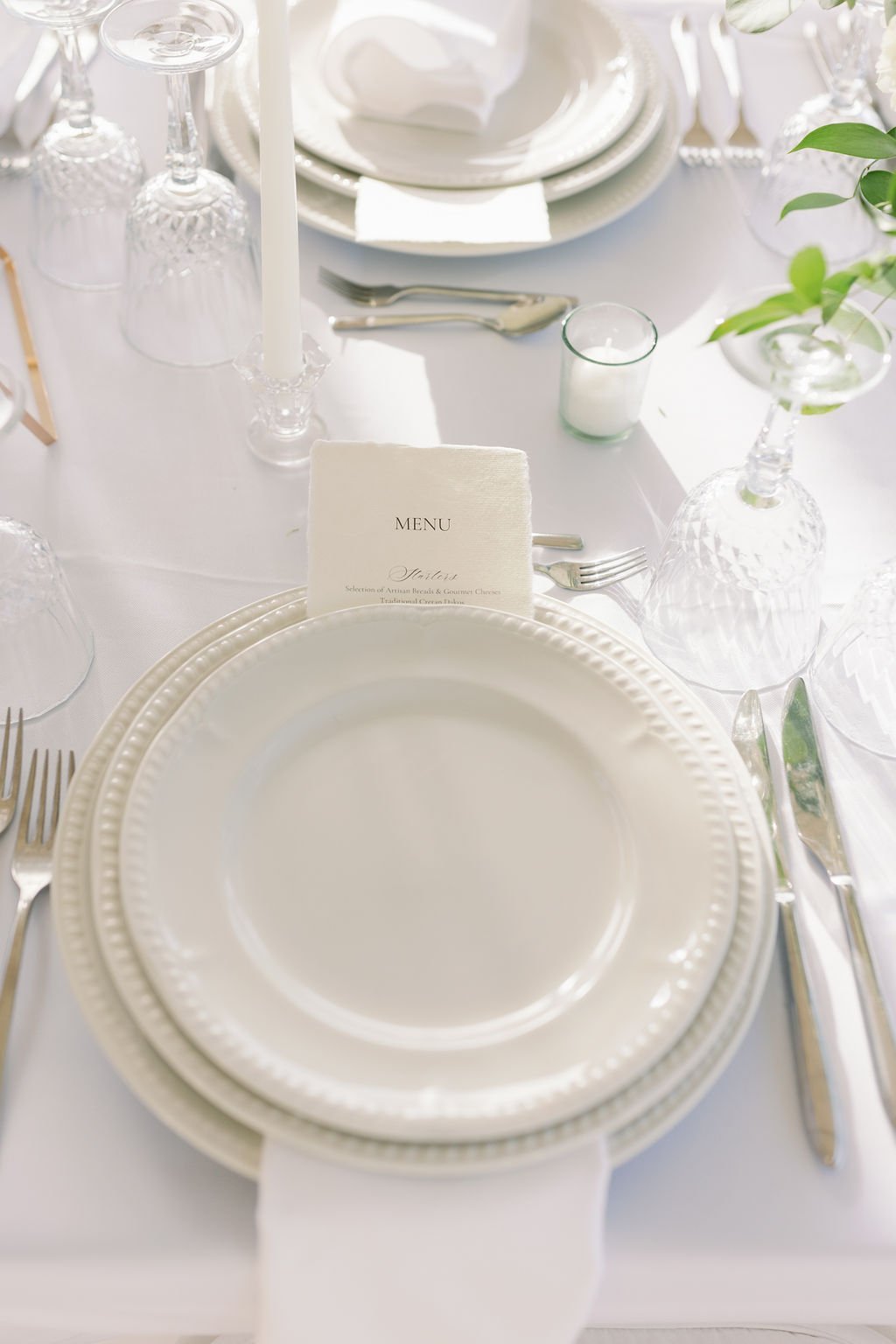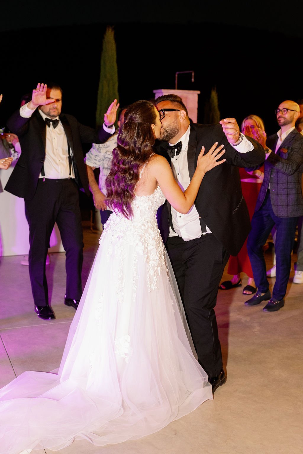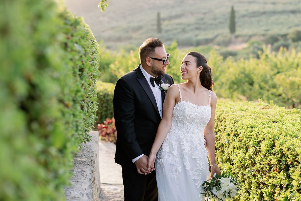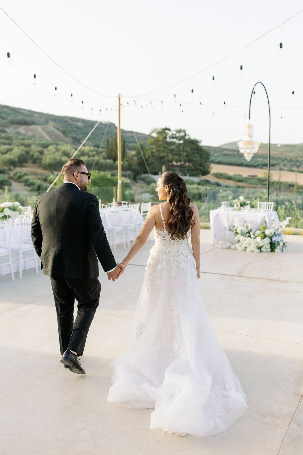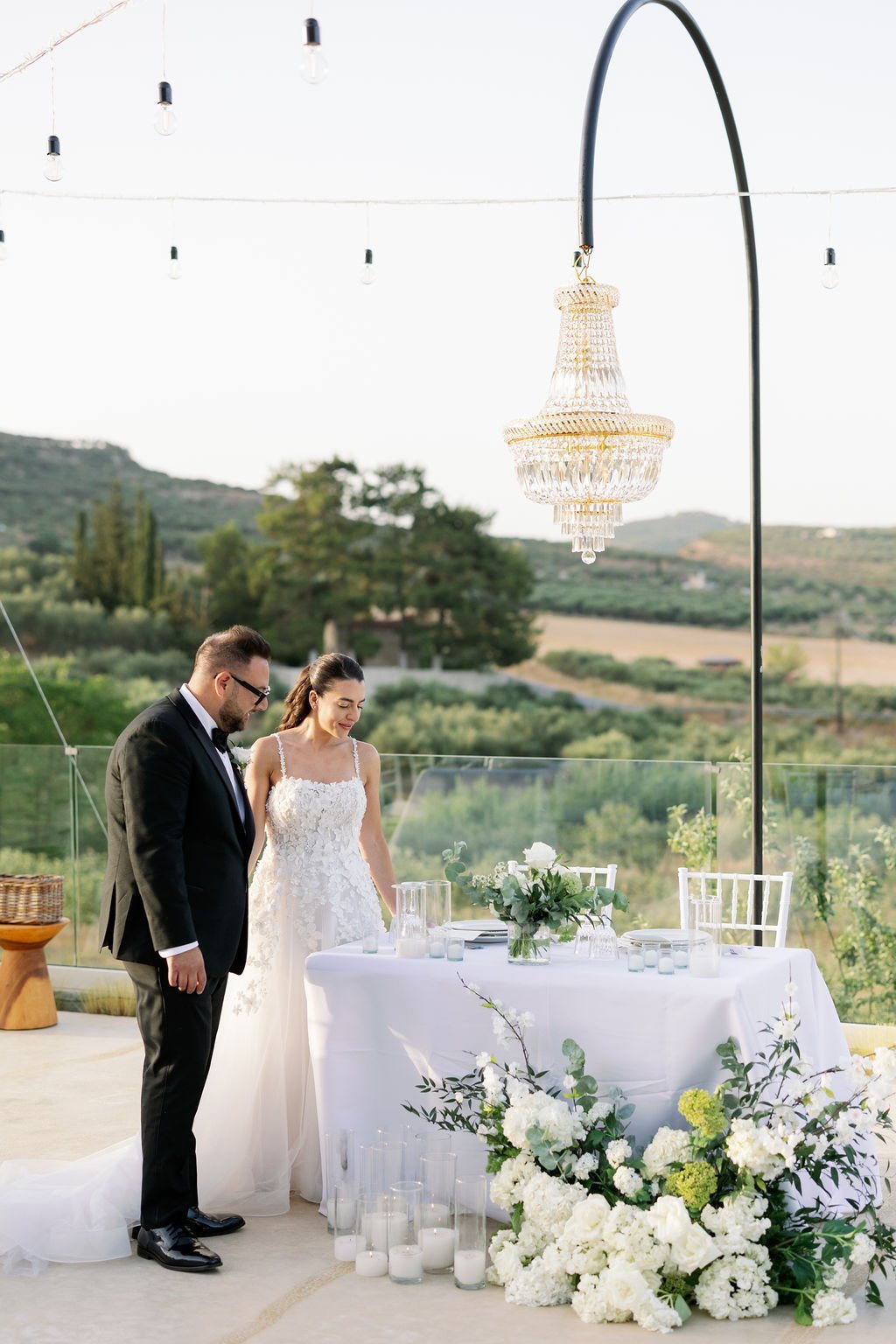 After the ceremony, guests returned to Mantillari Estate, where the villa had been transformed into a refined yet romantic reception space filled with white florals, candlelight, and soft overhead lighting that mimicked a starlit sky. Personalized menus and name cards added thoughtful touches, while the warm glow of the décor created an inviting, intimate atmosphere for dinner and celebration. Planned and coordinated by The 25 Project, the evening flowed effortlessly from heartfelt toasts to joyful dancing, blending tradition with modern elegance in a way that felt completely personal to Roula and Chris. From sacred church vows to a chic garden party under the lights, their wedding was a seamless, love-filled tribute to culture, family, and the magic of saying “I do” in Crete.
