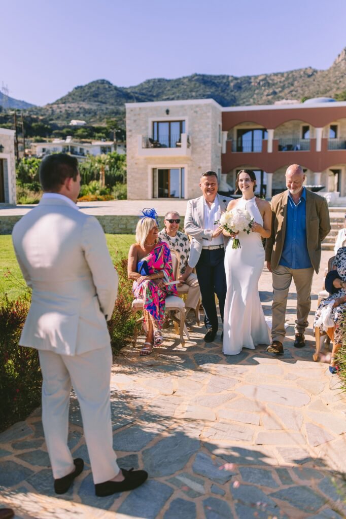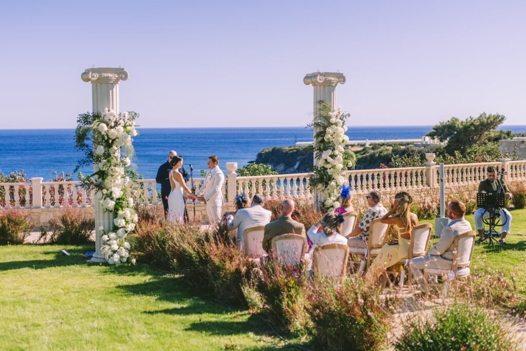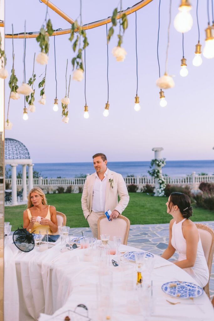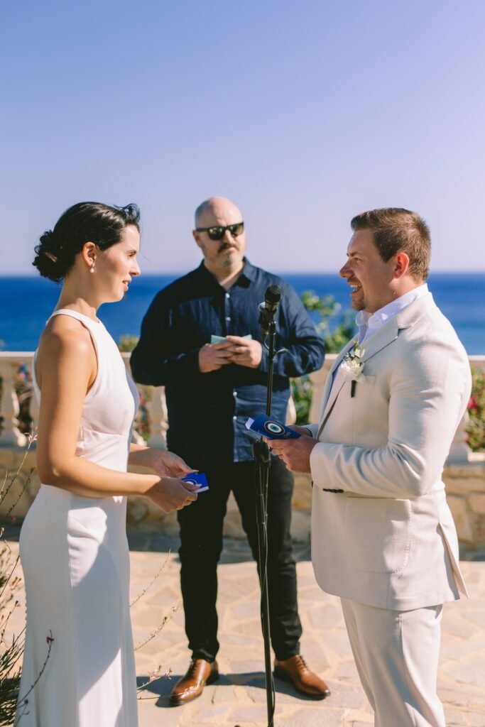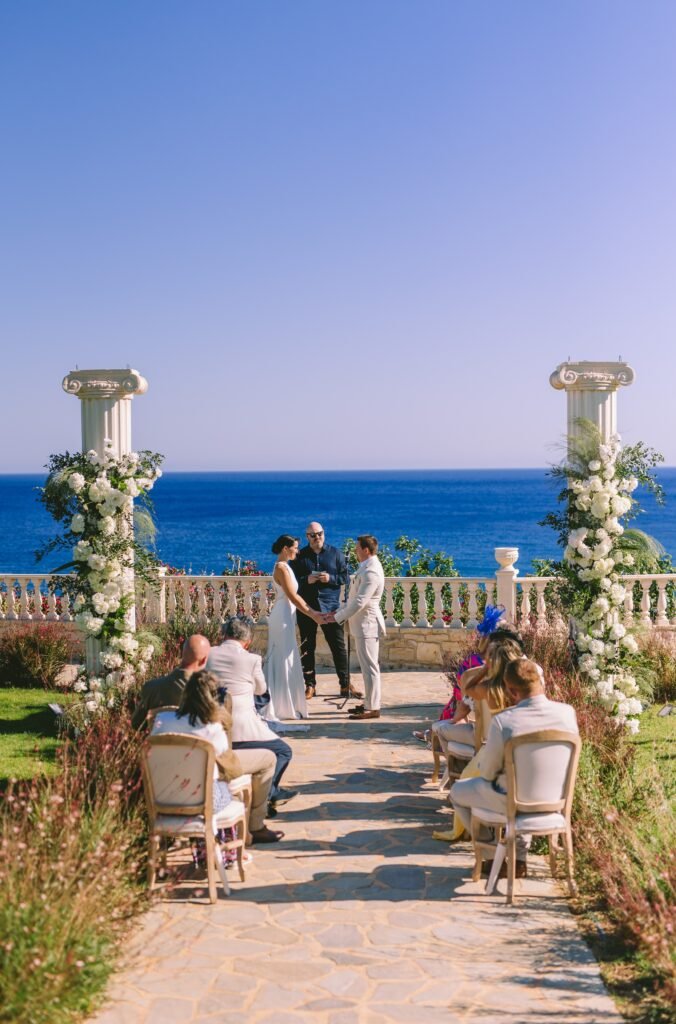 At the beginning of this season, we had the pleasure of planning Ross and Rachel’s intimate wedding. Α small and personal celebration with only nine of their closest people. It took place at a private seaside villa, where the calmness of the surroundings set the perfect tone for the day.