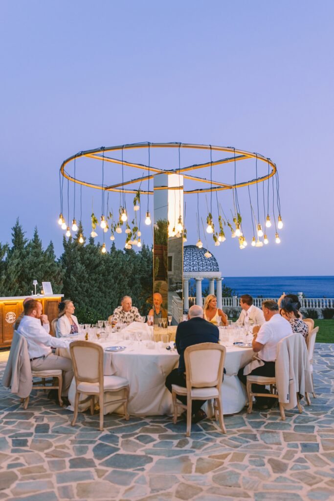 The dinner that followed was set around a single table, bringing everyone together in a relaxed, family-style setting. The decoration was intentionally minimal: natural fabrics, neutral tones, and candlelight to complement the environment rather than compete with it.